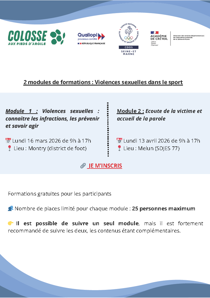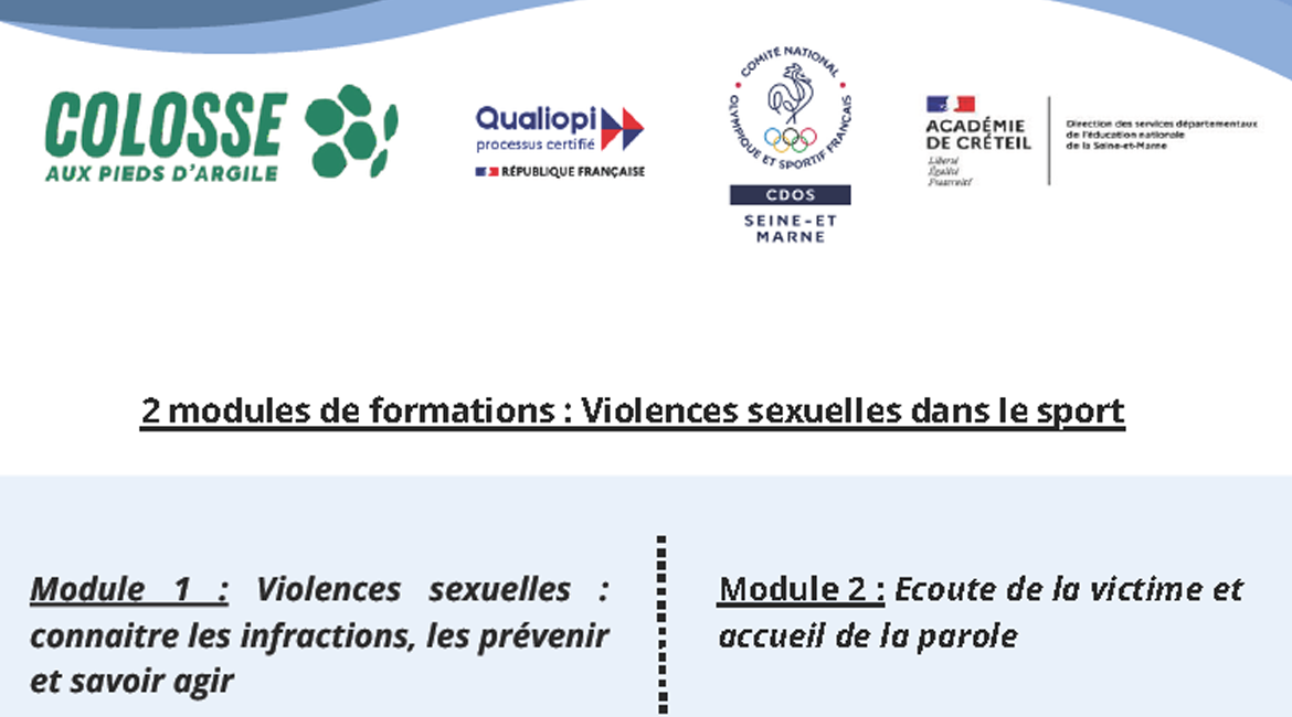 Dans le cadre des actions menées en faveur de la lutte contre les Violences Sexuelles dans le Sport et les Incivilités, le CDOS 77 organise deux modules de formation, 100% gratuits, en partenariat avec Colosse aux pieds d’argiles :